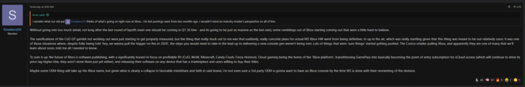 ويرى المسرب أن مايكروسوفت قد تتخلى عن فكرة تطوير جهاز جديد تمامًا، وأن اسم Xbox قد يظل فقط على أجهزة تصنعها شركات أخرى (OEM)، مثلما فعلت شركة ASUS في سلسلة ROG Ally.