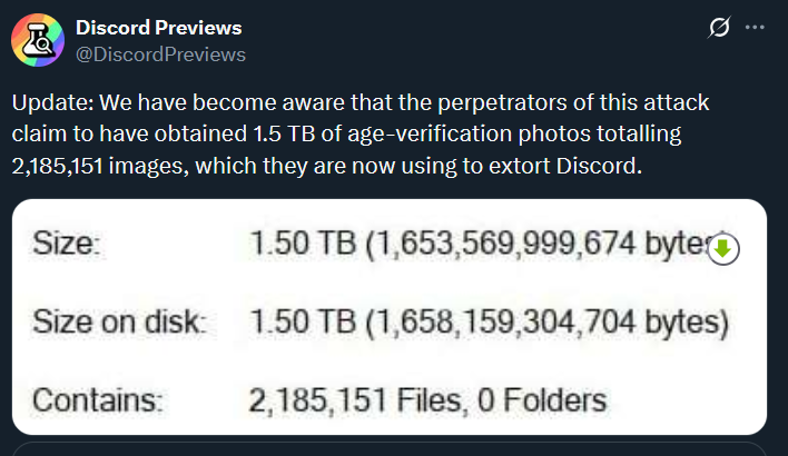 وفقًا لمصدر الأخبار المتخصص Discord Previews، فإن المجموعة التي أعلنت مسؤوليتها عن الهجوم تدّعي حصولها على 1.5 تيرابايت من صور التحقق من العمر، أي ما يعادل 2,185,151 صورة تم رفعها من قبل المستخدمين. وتُستخدم هذه البيانات حاليًا – كما هو الحال في معظم هجمات الابتزاز الإلكتروني – لمحاولة ابتزاز شركة Discord.