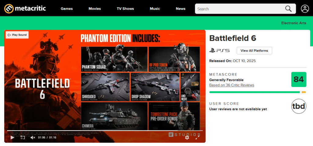 تطلق Electronic Arts أحدث إصدارات سلسلة التصويب الشهيرة Battlefield 6 في 10 أكتوبر 2025، لتحقق بداية جيدة مع تقييم 84/100 على موقع Metacritic بناءً على مراجعات 36 ناقدًا، ما يجعلها واحدة من أكثر الإصدارات استقبالًا إيجابيًا في تاريخ السلسلة الحديث.