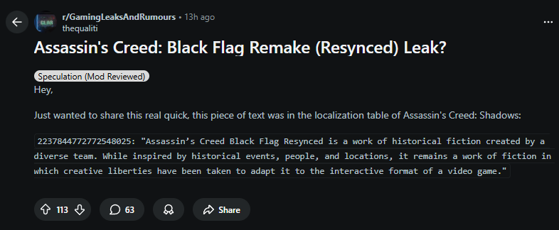 ماذا كشف التسريب؟ نشر أحد المستخدمين على منصة Reddit (في قسم التسريبات والشائعات) نصاً تم العثور عليه داخل “جداول الترجمة” (Localization Table) الخاصة بلعبة Assassin’s Creed: Shadows. النص هو عبارة عن رسالة إخلاء المسؤولية المعتادة التي تضعها يوبي سوفت في بداية ألعابها، ولكن المفاجأة كانت في اسم اللعبة المذكور: “Assassin’s Creed Black Flag Resynced”