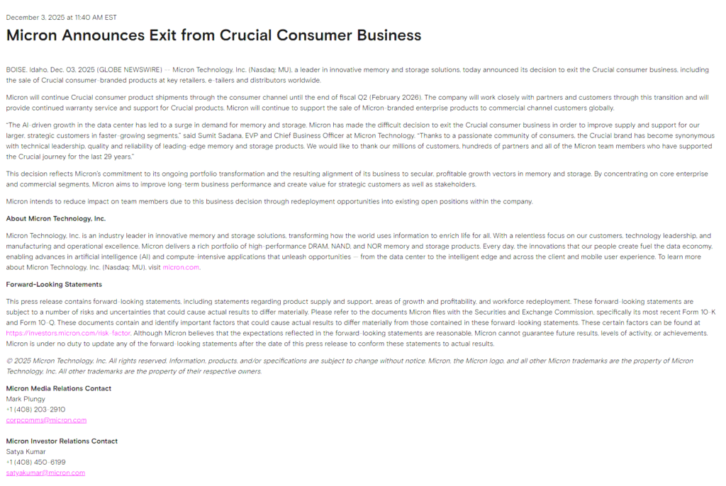 تفاصيل الإغلاق والجدول الزمني وفقاً للبيان الرسمي، ستتوقف الشركة عن بيع منتجات Crucial عبر المتاجر ومنافذ التجزئة العالمية، ولكن العملية ستتم تدريجياً: