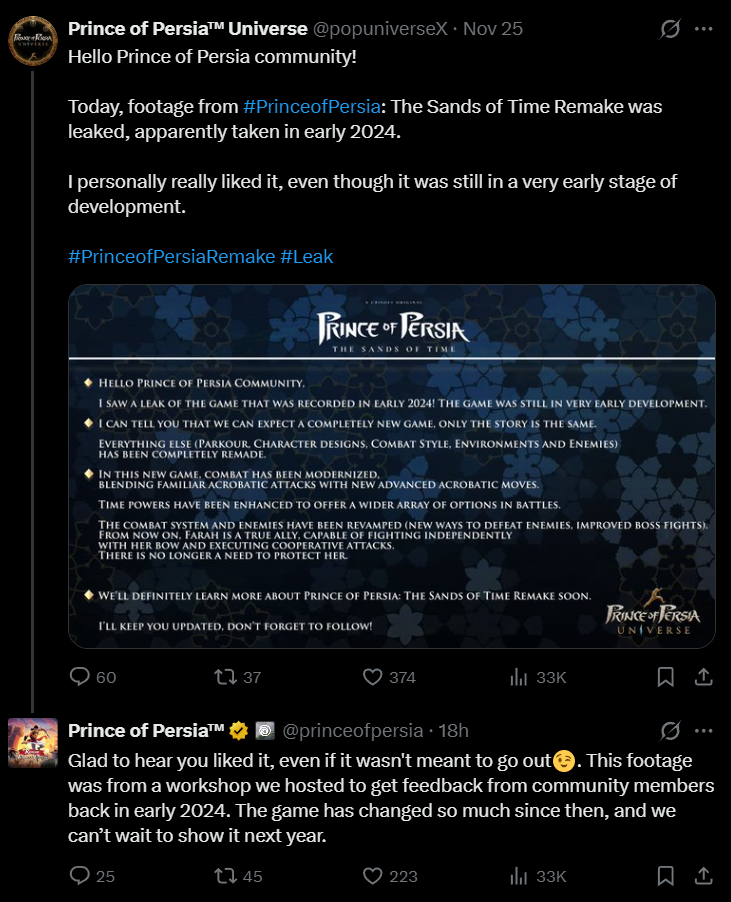 الرد الرسمي من المطورين في رد مباشر على التسريب، علق الحساب الرسمي لسلسلة Prince of Persia على منصة X قائلاً: