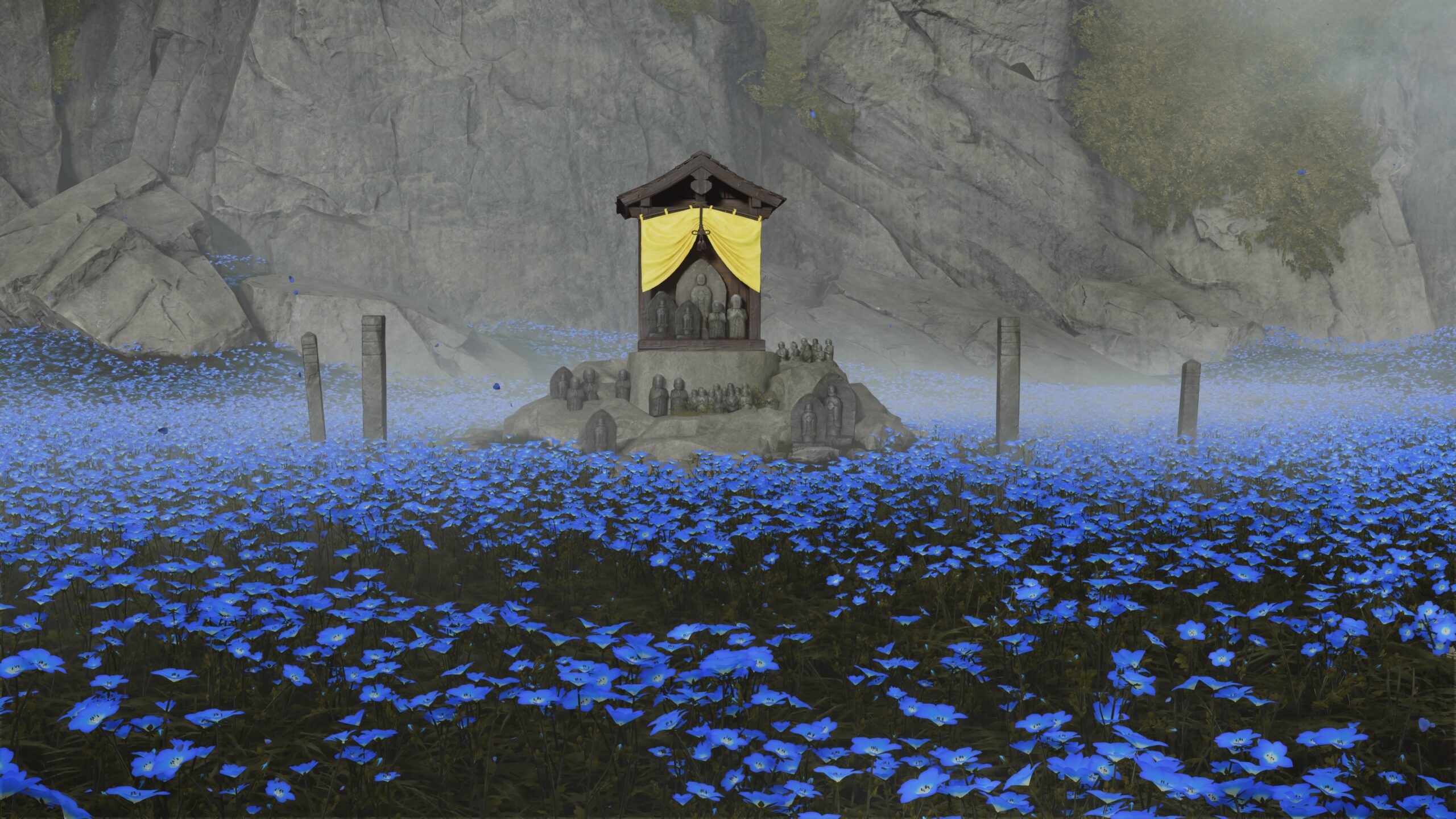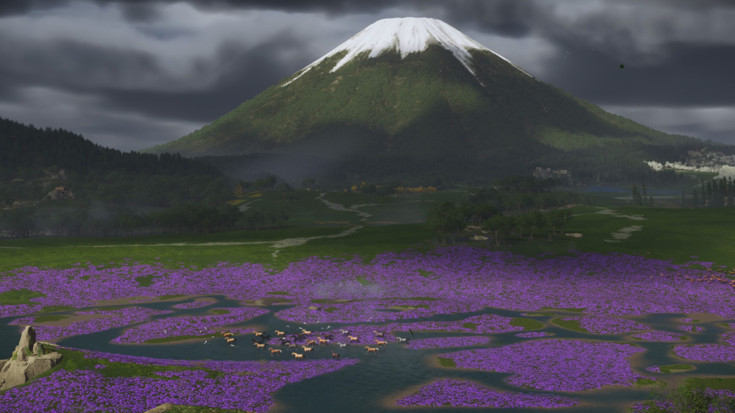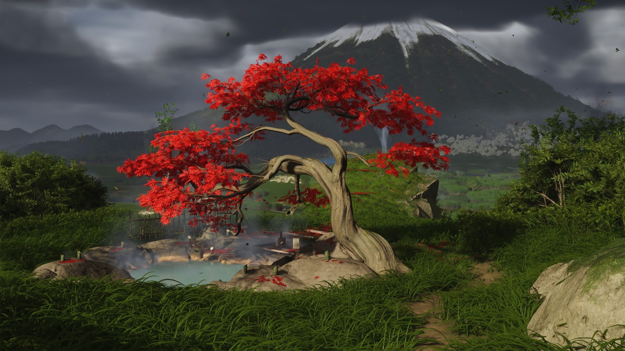 تُعد البيئة في Ghost of Yōtei واحدة من أكثر الجوانب إبهارًا. العالم مصمم بعناية لالتقاط جمال الطبيعة اليابانية الشمالية بكل تفاصيلها: