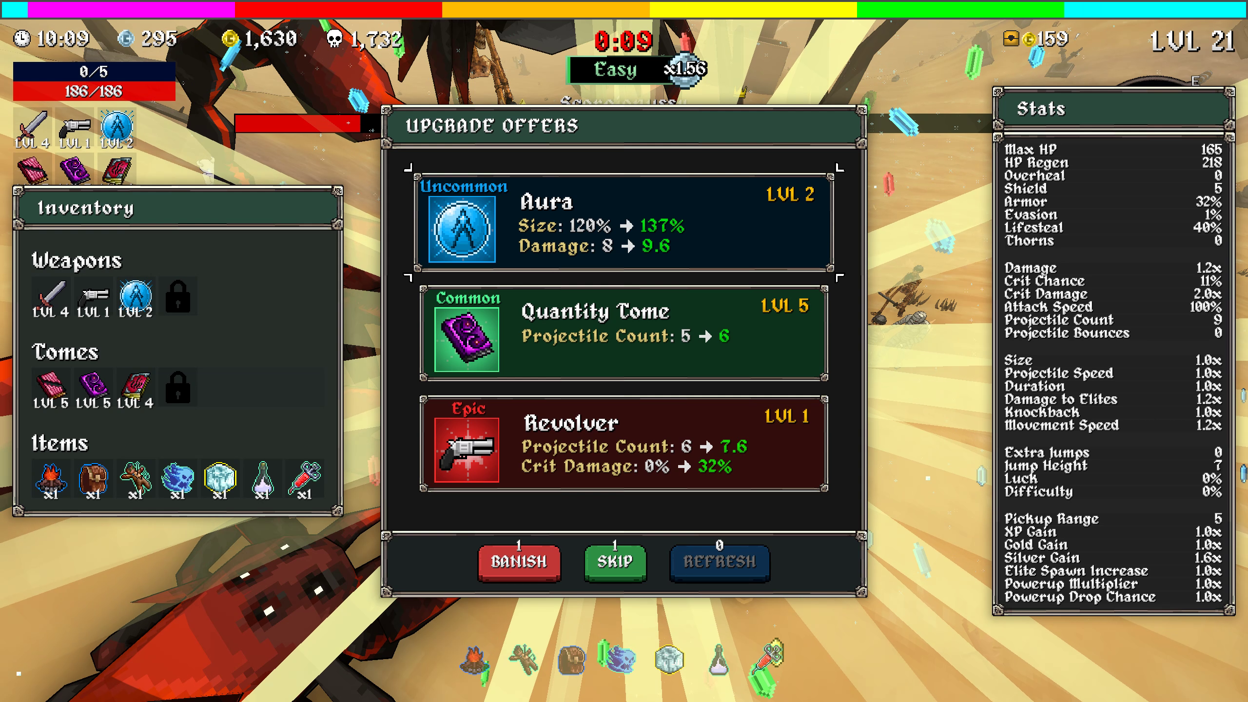 في جوهرها، MEGABONK هي “Reverse Bullet Hell”: تدخل خريطة عشوائية، تكتسح أسراب الأعداء، تلتقط الخبرة واللوت، وتبني “Build” يجنح للسخافة الممتعة كلما تقدّمت الدقيقة. اللعبة تعلن هويتها بوضوح على صفحة ستيم: Roguelike Survival بخرائط مولّدة عشوائيًا، ترقية شخصيات وأسلحة، ومدى بقاء يقاس بالدقائق—“إلى أي مدى تستطيع الصمود؟”