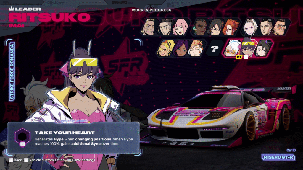 يضمّ العالم 15 سيارة فريدة، لكل منها مهارات خاصة مستوحاة من خلفيات الشخصيات، مما يخلق تنوعًا في أسلوب اللعب والتكتيك داخل كل سباق.
