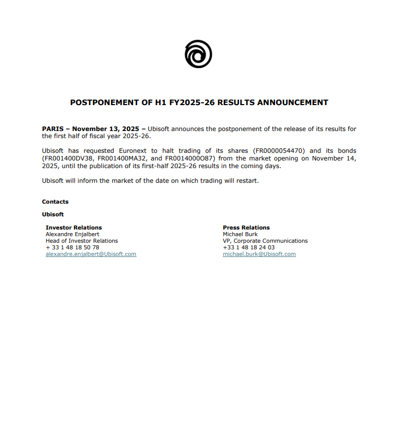 وفقًا لبيان الشركة، طلبت Ubisoft من بورصة Euronext إيقاف تداول أسهمها وسنداتها ابتداءً من 14 نوفمبر، إلى حين نشر النتائج خلال الأيام المقبلة. وأكدت أنها ستقوم بإعلام السوق فور تحديد موعد استئناف التداول.